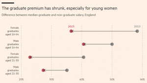 So why does anyone still enrol in university? The answer is that graduates can still expect to earn more than their peers without university degrees (although this premium is shrinking, especially for women). This is little consolation, however, because the lucky few who do secure employment can expect lower wages than graduates from past cohorts. Recent data shows that graduate salaries have not kept up with wage growth in general.