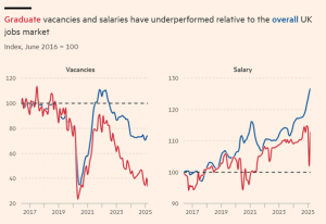 University graduates in the UK struggle to enter the workforce. The number of job openings advertised for graduates in 2025 is 33% lower than 2024. This reflects slack in the labour market but graduates are hit the hardest. The percentage of graduates who had secured employment by February 2025 dropped to 27%, six per cent below 2024.